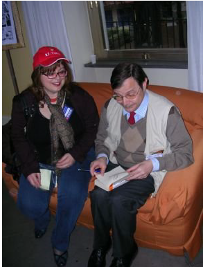 Intanto tra una telefonata e l’altra dei nostri amici che non sono potuti essere qui e vogliono la cronaca in diretta, tra una conferenza ed una sosta davanti al tavolo dei libri in vendita (acquisto tre Robot d’annata per il mio socio Fungaz) si fa ora di cena e in tempo per la cena arrivano Giuseppe Lippi e Tatana, la sua signora.