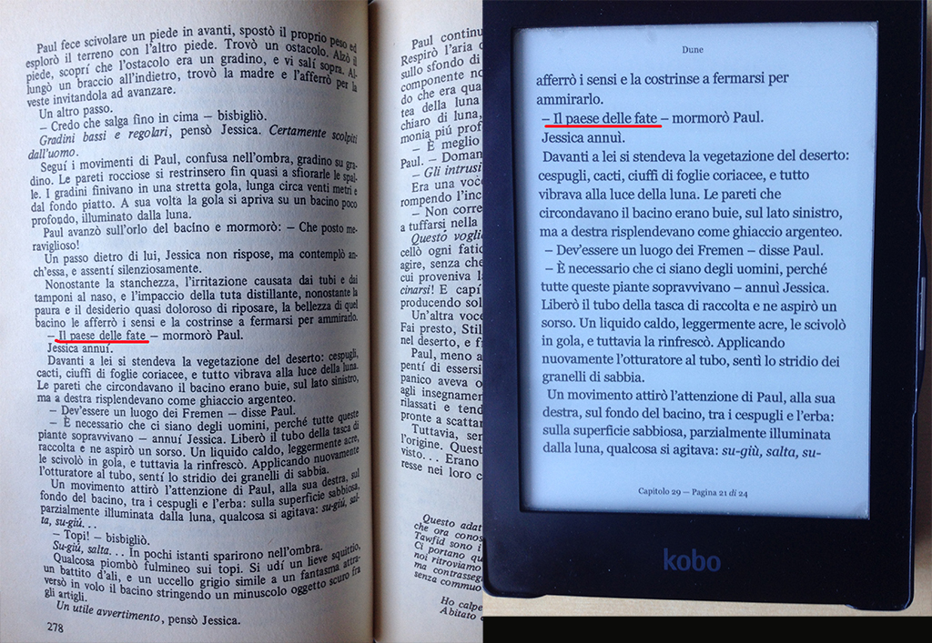Questa è la differenza, la ragione per cui in tre sere ho letto più della metà di questo romanzo. Su Dune non dico nulla, ormai credo che sia stato detto tutto e sarebbe solo una ripetizione non necessaria. Dico solo che, nonostante mi faccia piacere “possedere” fisicamente un libro di carta, vederlo sul ripiano della libreria, prenderlo in mano per cercare un passo particolare, guardare la copertina come si guarda un dipinto, nonostante questo preferisco mille volte leggere su un e-reader.Per questo, quando è possibile, compro sia il libro di carta che l’e-book perché uno resterà qui, davanti i miei occhi e potrò toccarlo fin quando avrò voglia, l’altro sarà disponibile solo fino a quando avrò un dispositivo per leggerlo.