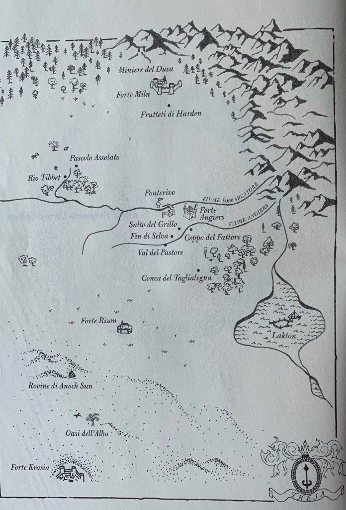 Il peso è di 2185 grammi, pesantuccio da leggere a letto ma si può fare; è vero esiste l’e-book ma poi ti perdi le belle illustrazioni di Broniek e la mappa di Thesa. Il volume contiene tre romanzi legati da un’unica trama che si sviluppa per 1574 pagine. È il racconto in soggettiva di otto personaggi principali: Leesha, Arlen, Rojer, Amman, Inevera, Renna, Abban che seguiamo dall’infanzia all’età adulta, e che compone la storia di due popoli in lotta perenne con i demoni.